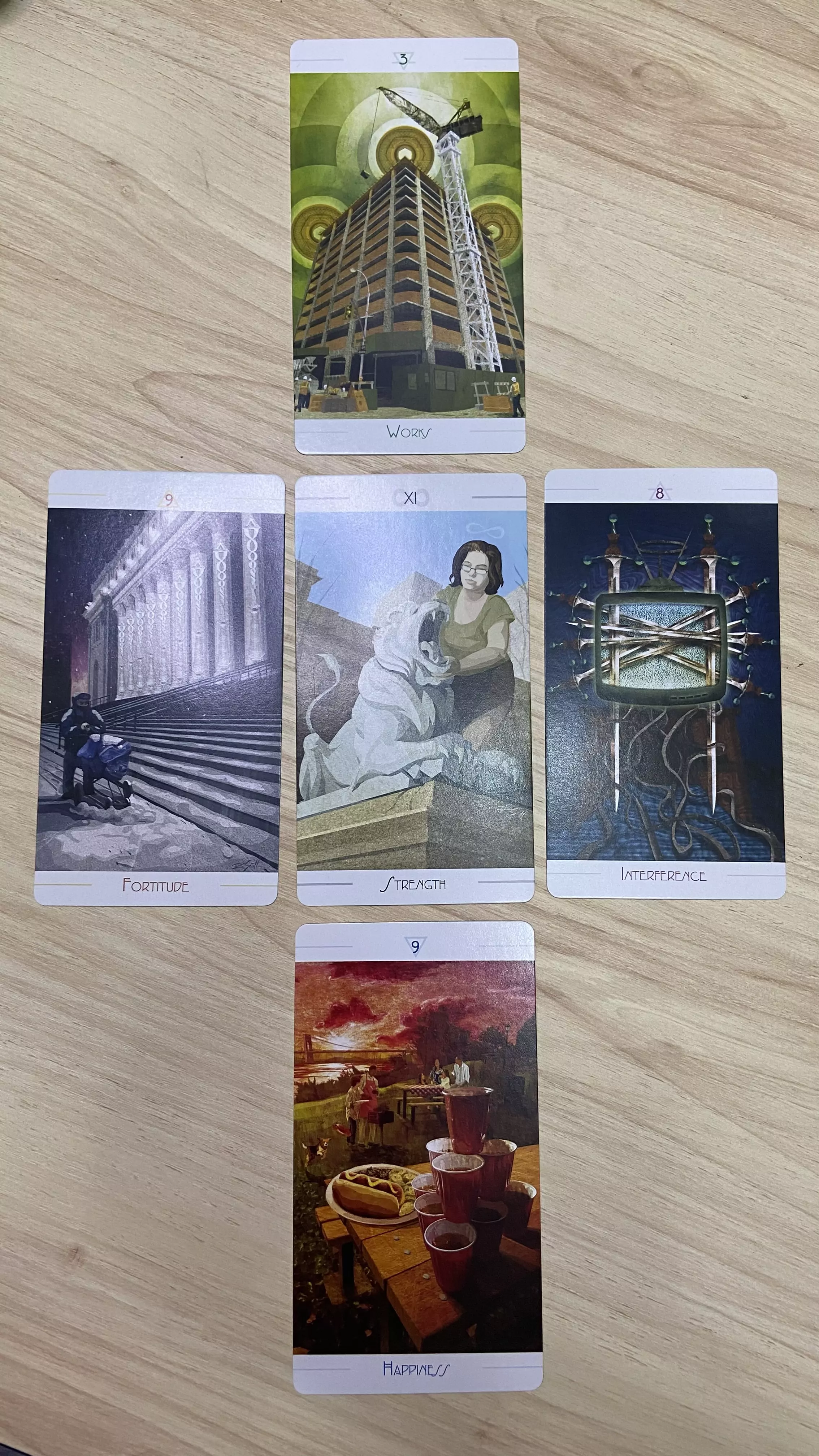 以往的四季牌陣都在焦慮:「為了生存需要賺錢」、「為了賺錢要為五斗米折腰」,然而搬到高雄後這季的目標是「讀完手邊的人類圖」、「行光合作用」及「讓自己成為一棵大樹」,這跟我在台北時的狀態很不一樣,至於在台北所焦慮的議題,就隨天吧。