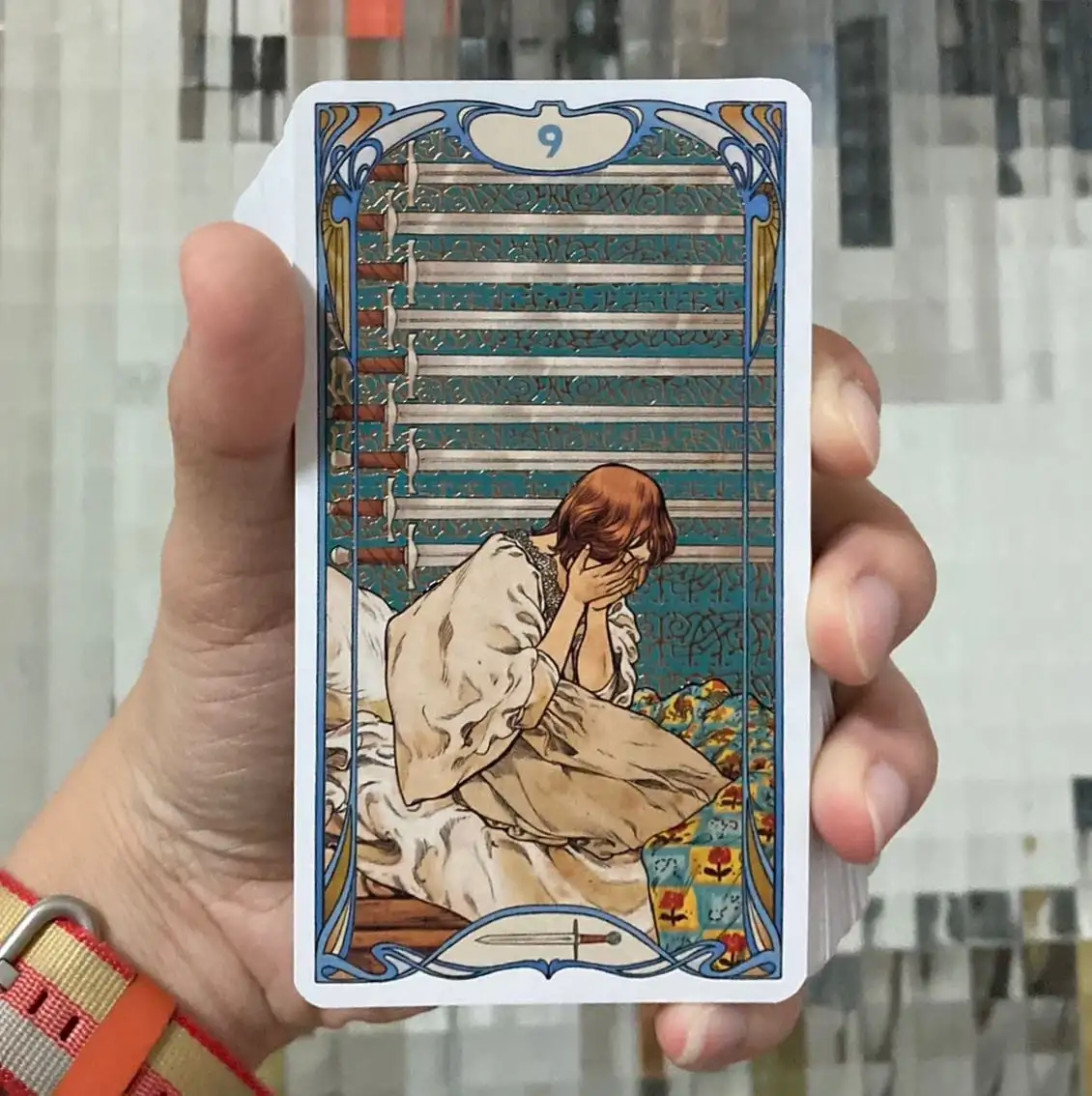 看這麼多種類的牌,讓她自己挑,讓她自己感受她對哪一副有興趣。​最後選了一張最浮誇的Golden Art Nouveau Tarot。​