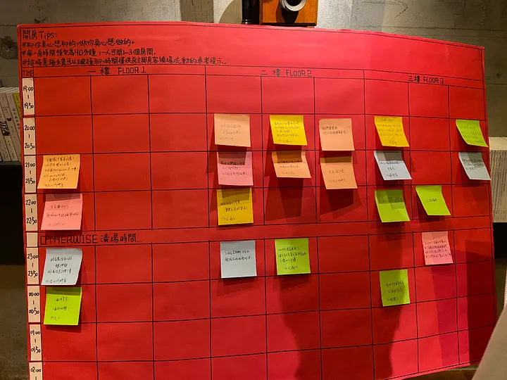 前兩天我去參加Otherwise Library的第二回《在圖書館開房間》,活動時間是19:00-03:00,表定每個房間開40分鐘後換場,一樓有便利貼大表,可以看有什麼房間(討論的主題),或留下你想開的房間。
