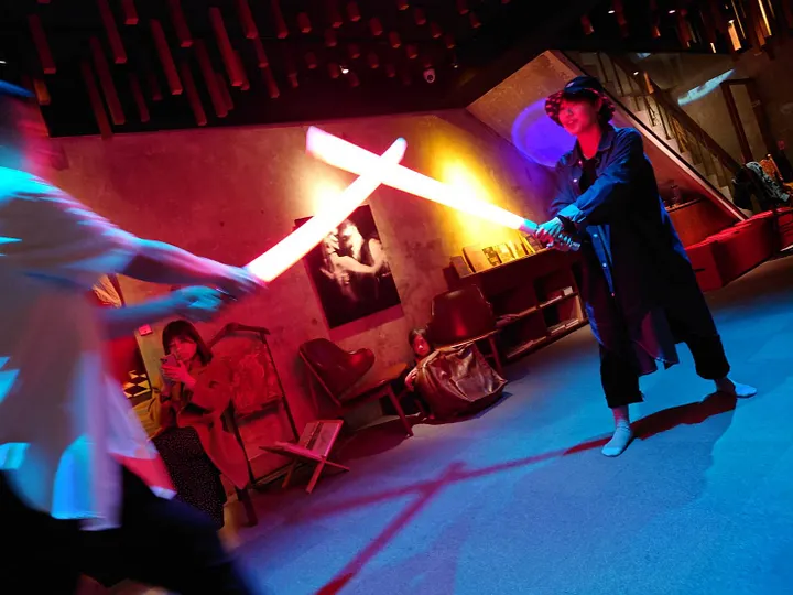 接到B之後,我跟B大致介紹整個活動、流程跟空間後,我就看到A在二樓玩光劍對決。這時我眼神一亮,決定跟他玩幾場,就有了上圖的照片。