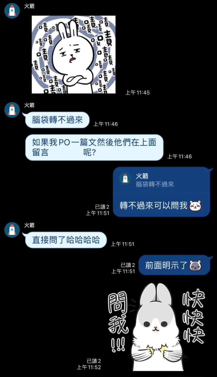 上面的群組截圖中可以看到:對火箭來說,他已經提出詢問,所以才會說出「直接問了」,但對我來說火箭的各種訊息其實沒有真的「詢問我」,所以我才會發出ㄇㄚˊ幾兔的「快快快問我!」貼圖等待火箭的詢問,但最後當然一樣沒有「詢問我」,所以最後我就用2–3種可行的方法轟炸他。