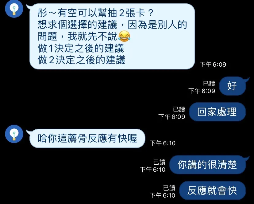 像這個例子就可以從對話中很清楚的知道對方要什麼:「抽卡」求「選項發展」以及「建議方向」,所以我知道我一有空就可以用線上抽卡的方式提供牌面跟解析給他,我也就可以馬上回覆說「回家處理」。