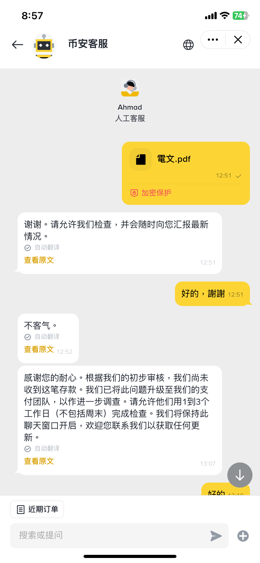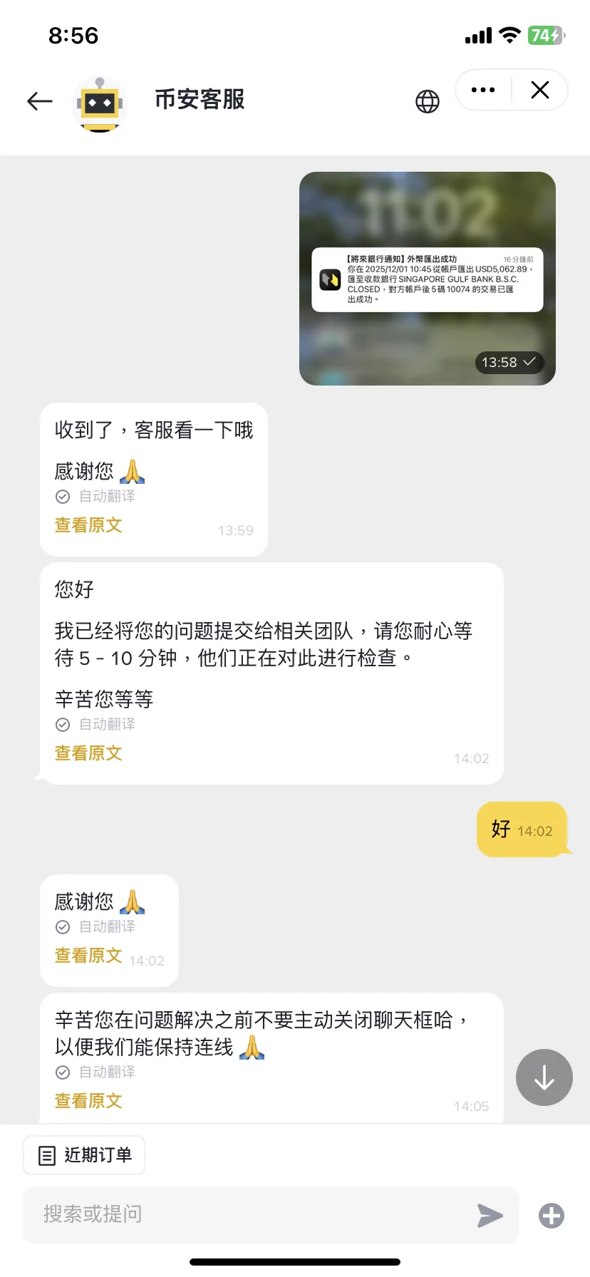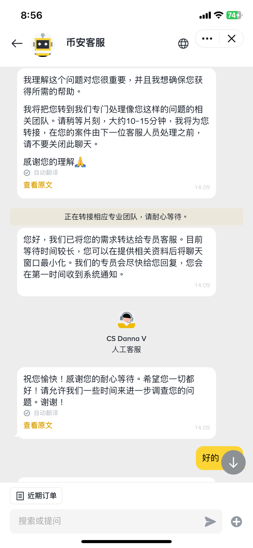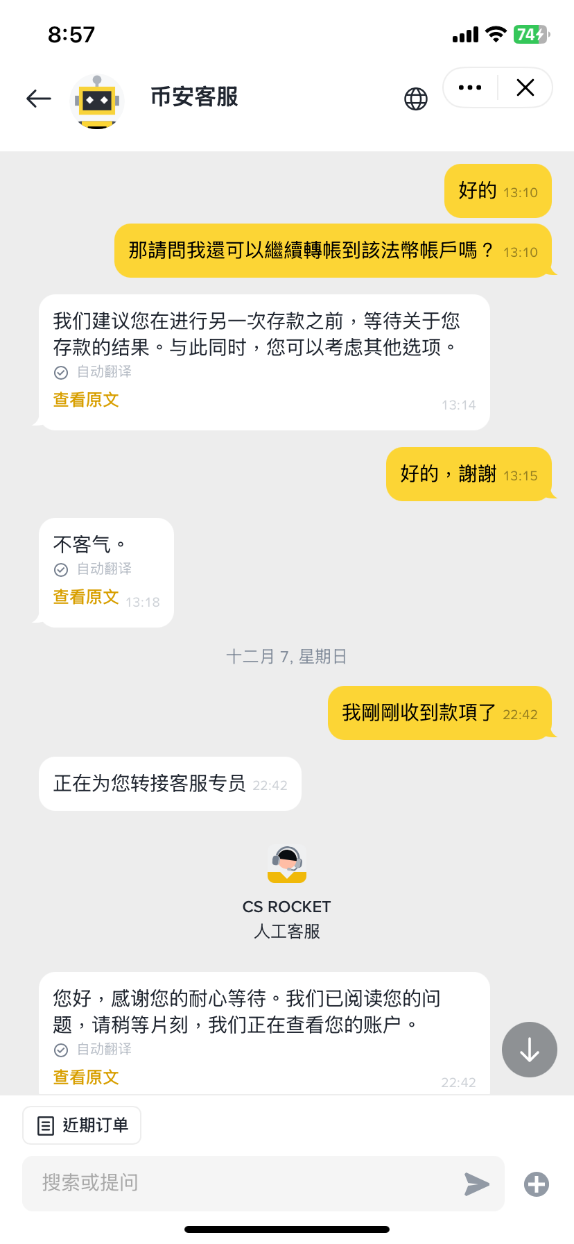 與幣安客服對話的截圖
