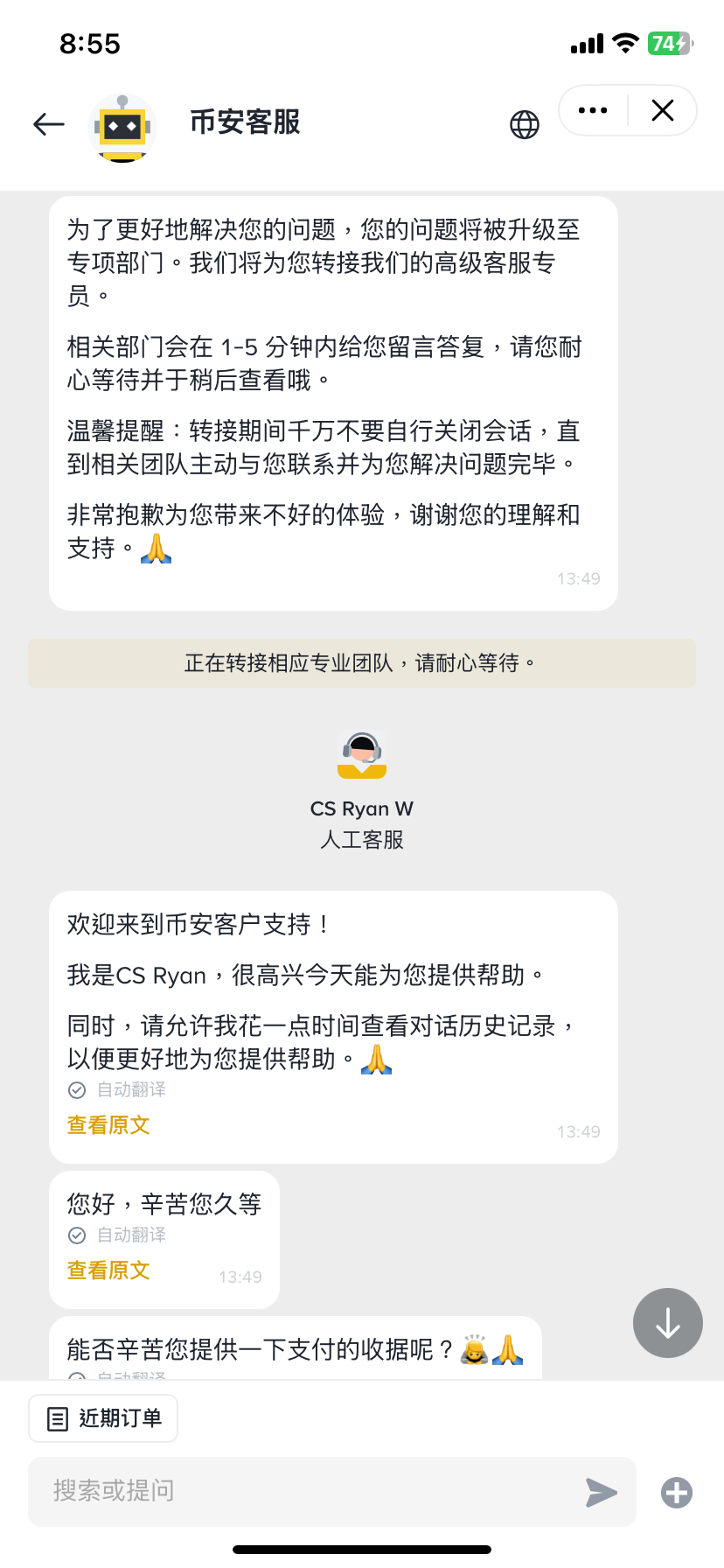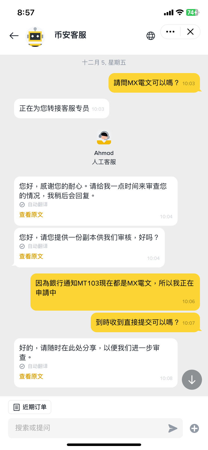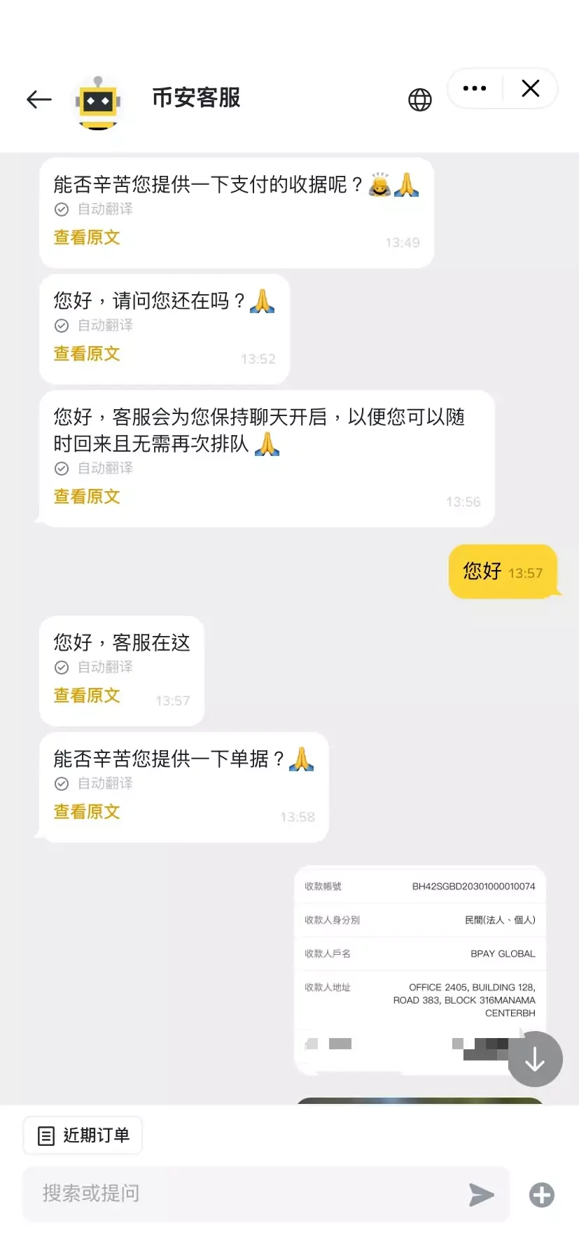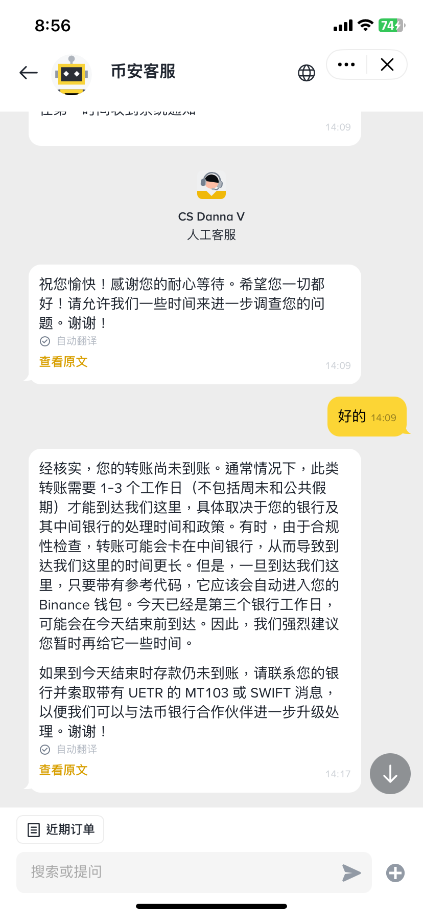 與幣安客服對話的截圖