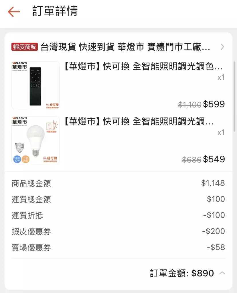 最後我順利的在 10/10 00:01 使用蝦皮提供的 1000-200 優惠券,以 $890 拿下華燈市燈泡組。