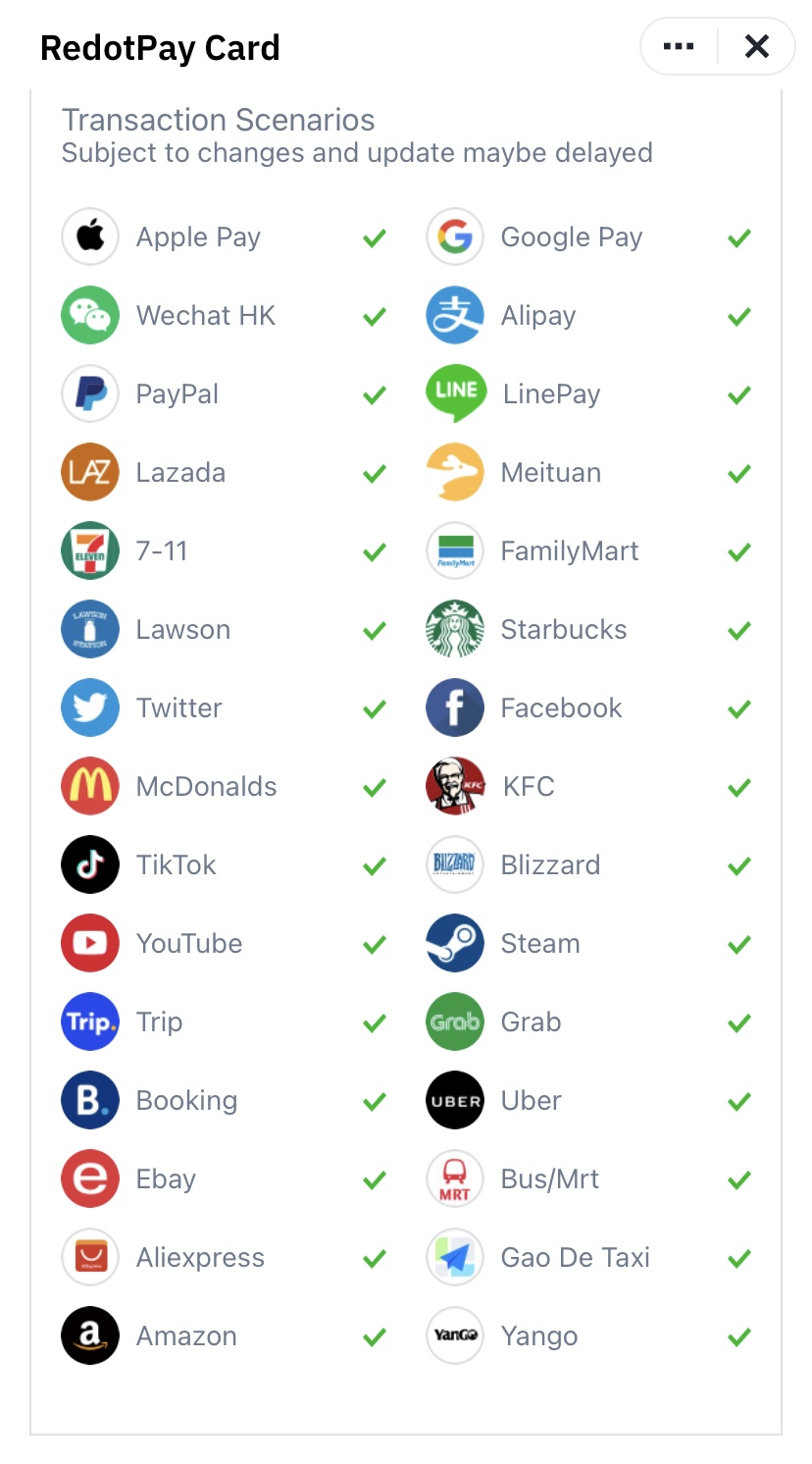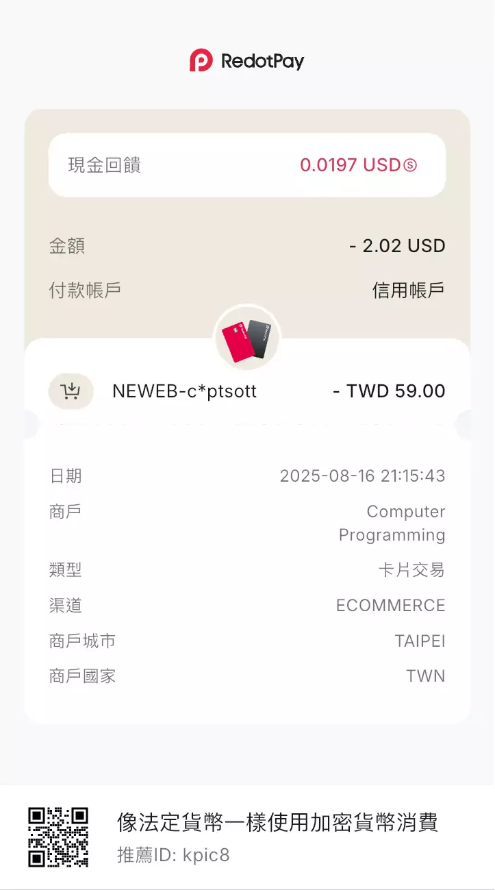 RedotPay 加密貨幣信用卡與簽帳卡(Debit Card)無法延後付款類似,只是用加密貨幣結算消費。