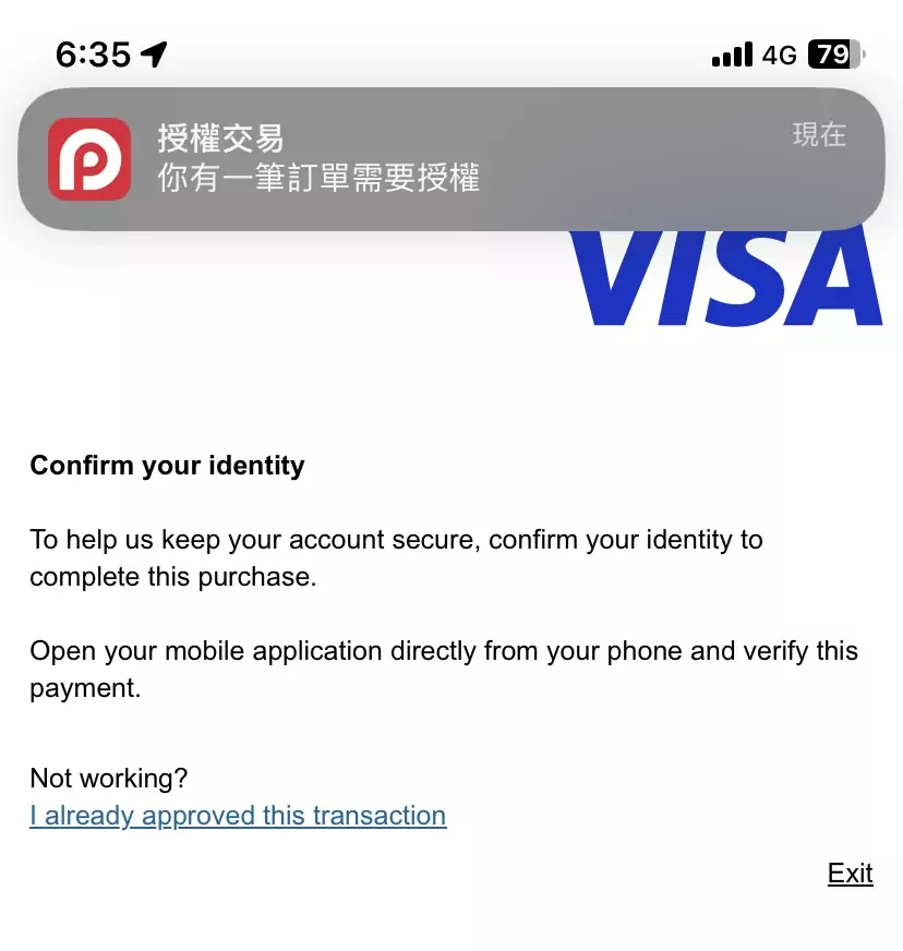 選 APP 驗證,會跳出「你有一筆訂單需要授權」的通知:
