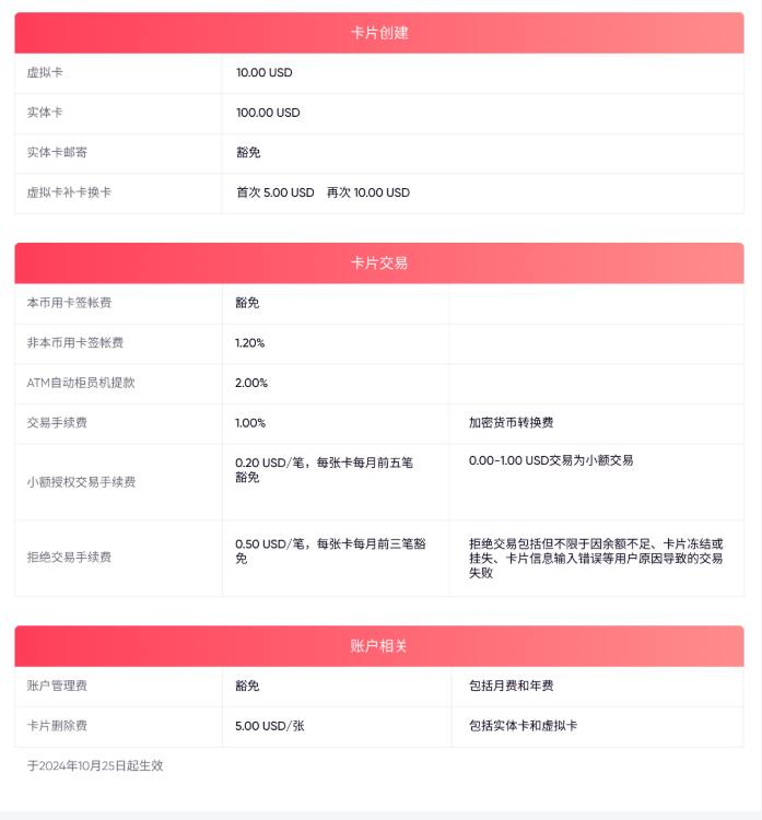 啟動時,會收取一次性費用:虛擬卡 10 USD、實體卡 100 USD。